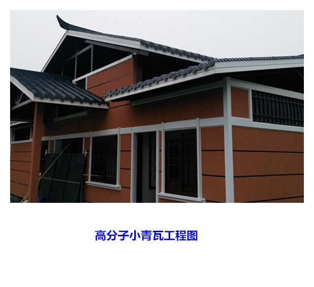 高分子小青瓦外觀美觀大氣。既具有古小青瓦古樸的傳統風格、又具有典雅的現代色彩、提升建筑物檔次、彰顯建筑風格的裝飾效果,是一種典型的具有中國文化特色的屋瓦產品。高分子小青瓦是一種新型的仿古小青瓦,是古小青瓦、釉面小青瓦的更新換代產品。