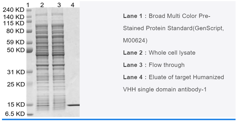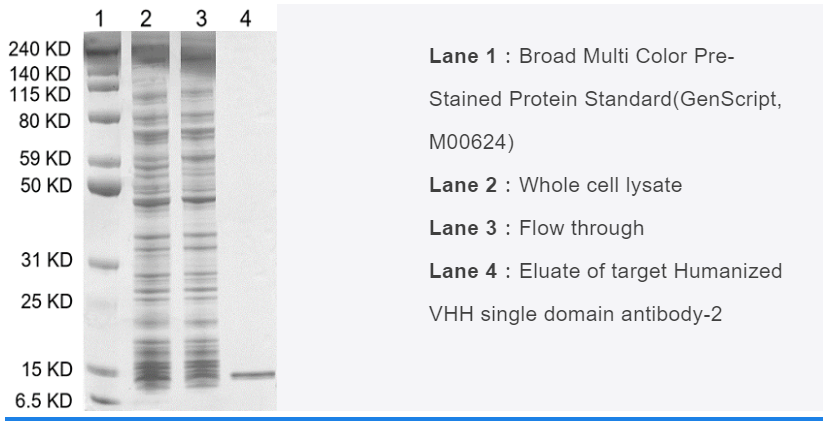 該產品的親(qin)和配基(ji)Anti-Humanized VHH Antibody對人源(yuan)化(hua)VHH較高的親(qin)和力和特異(yi)性使(shi)其能夠從常用的蛋白質表達系統(如細菌、酵母和哺乳動物細胞)中(zhong)獲得較高純度(du)的人源(yuan)化(hua)VHH(如圖(tu)4所示)。