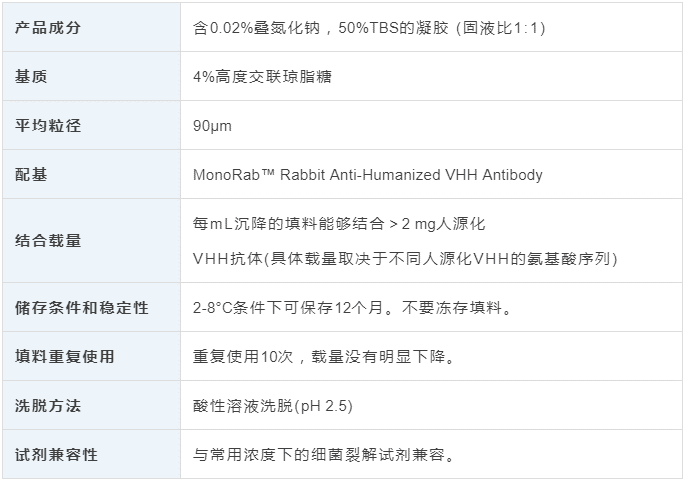 金斯瑞MonoRab? Anti-Humanized VHH Affinity Resin FF的主要特性如(ru)下表: