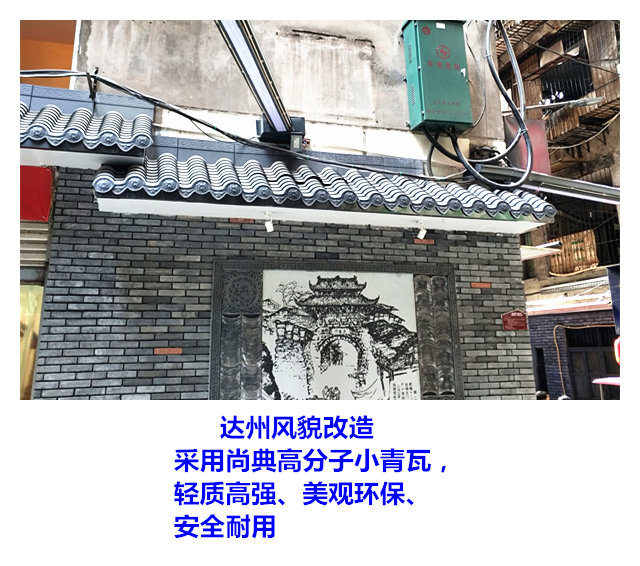 為了打造城市風貌,提升城市品位,打造川東名片,達州市委、市政府于2018年啟動了對老舊城區的綜合整治工程,先后對大小北街、龐家巷、醬油廠、蒲草田等街巷實施風貌打造,改造后的街道煥然一新,被老百姓稱為“達州的寬窄巷子”。該工程風貌采用四川尚典建材有限公司生產的高分子小青瓦,該產品輕質高強、美觀環保、色澤亮麗,與傳統瓦的優勢:高分子小青瓦輕質高強,單張面積大安裝簡便快捷,不用作基層材料,不用作防水材料,不用水泥沙漿粘貼, 防水效果好,終身不需要維修,表面光潔亮麗、不失光、不褪色可以保持長久如新。